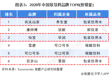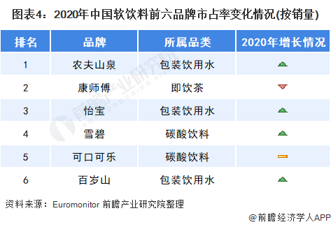 ??2020年,中國(guó)軟飲料行業(yè)前六品牌中只有農(nóng)夫山泉、怡寶、雪碧和百歲山的市占率相較2019年有所提高,除雪碧外其余三個(gè)品牌皆為包裝飲用水品牌??梢钥闯?,中國(guó)消費(fèi)者更青睞包裝飲用水,包裝飲用水企業(yè)更受歡迎。